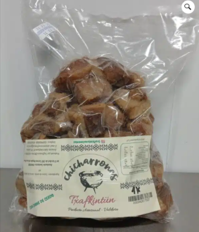 Chicharrones de Cerdo Trafkintún, hechos de grasa de cerdo, trozos de carne y sal, ofrecen un crujiente exterior y un interior jugoso. Perfectos como pan con chicharrones, snack o en tortillas de rescoldo, son una explosión de sabor y textura para disfrutar en cualquier momento del día.